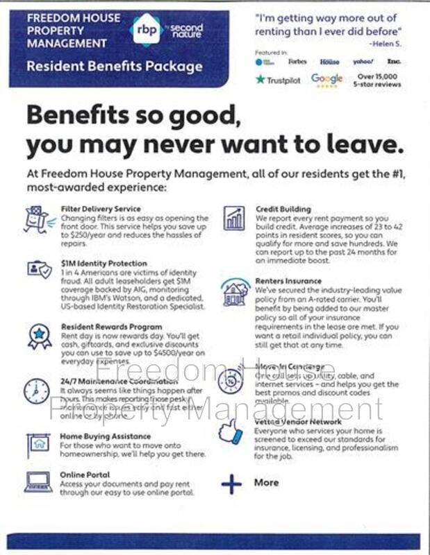 All Freedom House residents are enrolled in the Resident Benefits Package (RBP) for $40.95/month which includes renters insurance, HVAC air filter delivery (for applicable properties), credit building to help boost your credit score with timely rent payments, $1M Identity Protection, move-in concierge service making utility connection and home service setup a breeze during your move-in, our best-in-class resident rewards program, and much more! More details upon application. Other fees includes; Leasing Fee: $95, Application Fee: $55, Pet Fee: Ranges from $40 to $100, depending on pet type and size. These fees are essential to maintain the quality of our services and facilities provided. Please review these prior to application.